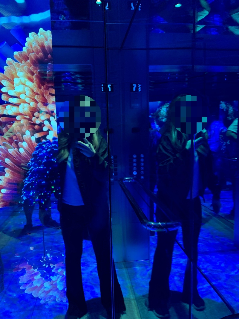 엘리베이터를 타면 꼭 바닷속에 들어와있는 듯한 기분이드는거 같다. 저녁이 되면 크루즈 내부에 조명도 바뀐다.