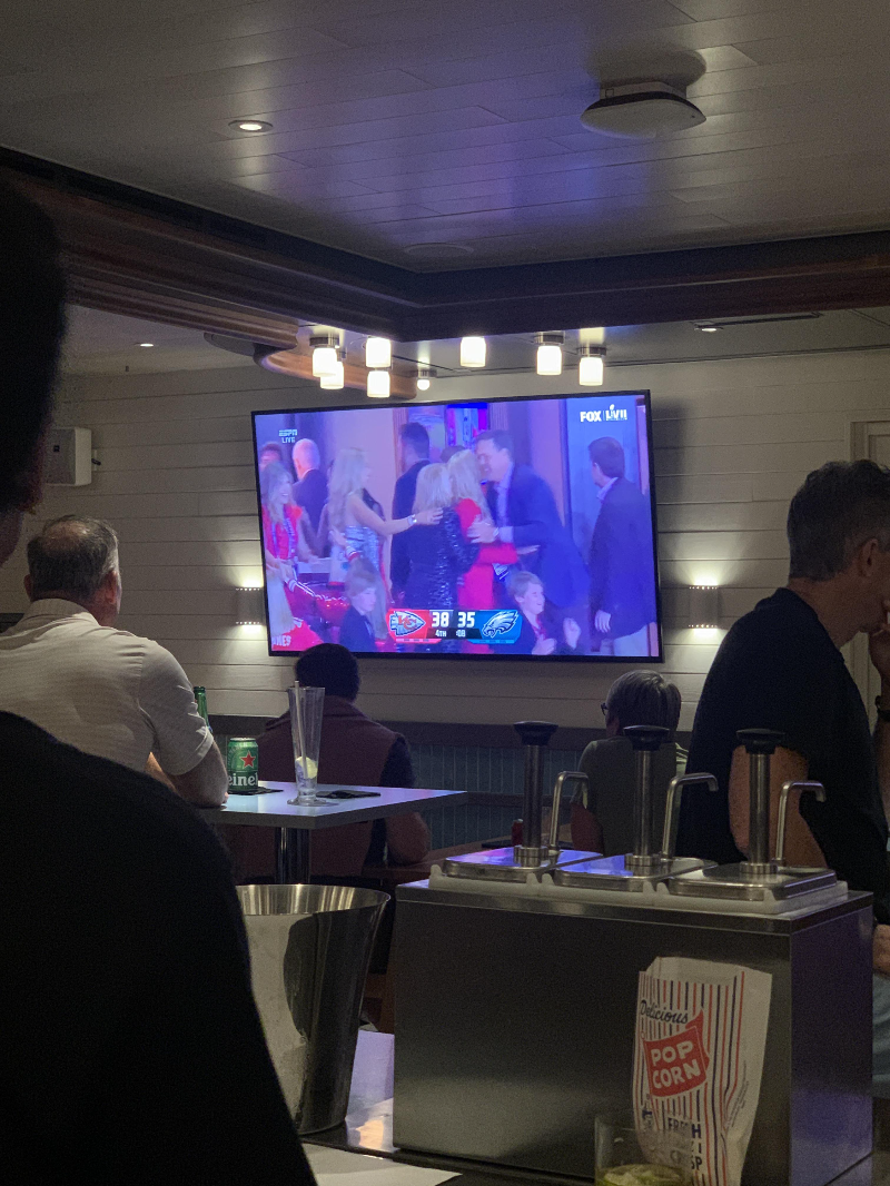 우리는 객실에서 하프타임까지 보고 버진보야지 크루즈 내부에 있는 스포츠 바 같은 곳에서 여러 사람들과 함께 관람했다.