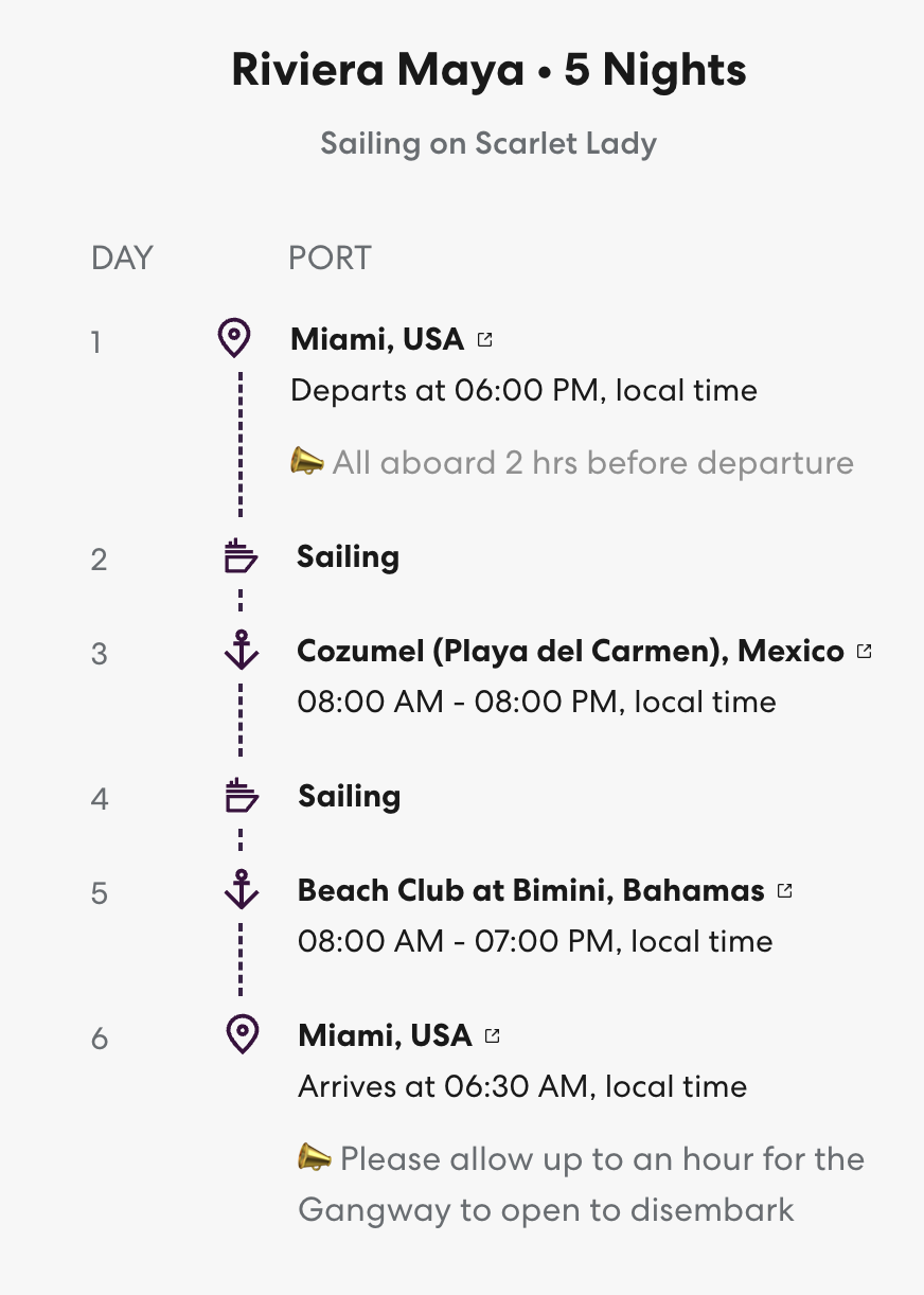 버진보야지 크루즈의 다양한 여행일정과 옵션이 있지만, 위의 일정표가 내가 선택한 버진보야지 크루즈 일정이다.
